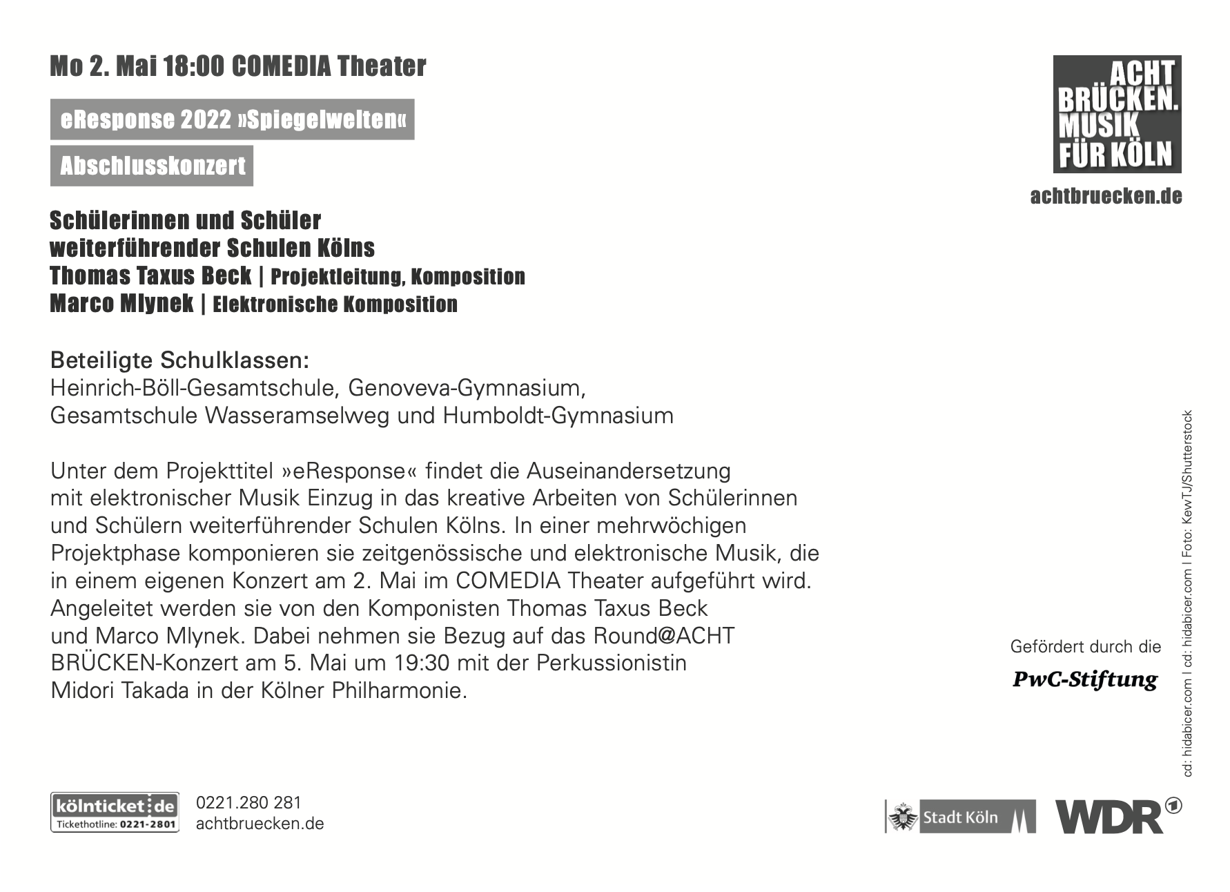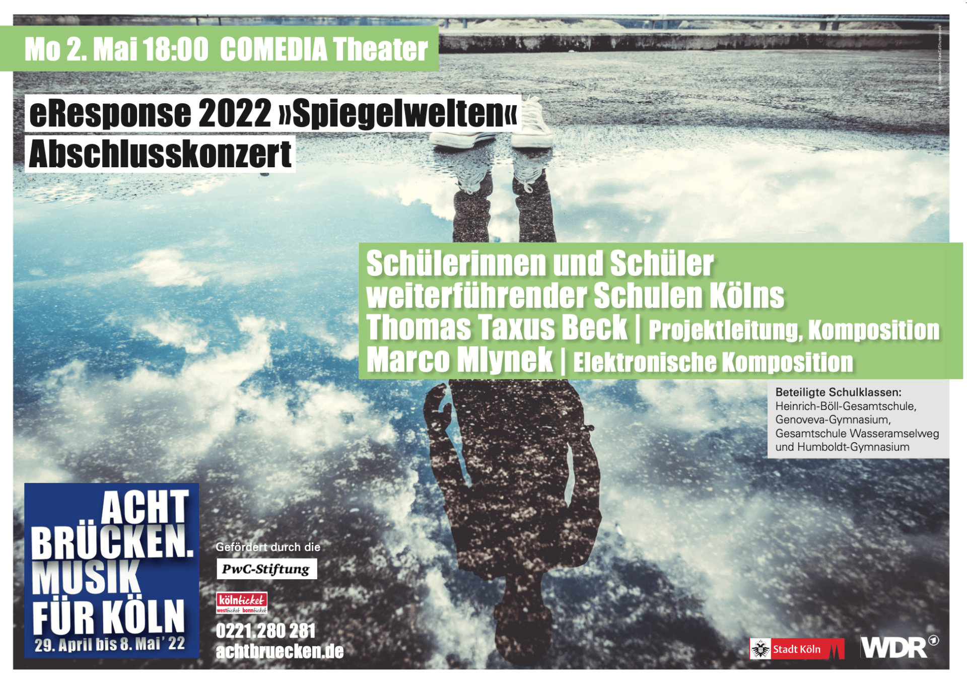 Ebenfalls im Rahmen des Festivals ACHT BRÜCKEN | Musik für Köln ist die 8.1.1 beim eResponse-Abschlusskonzert „Spiegelwelten“ am 2. Mai um 18 Uhr im COMEDIA-Theater zu hören – mit einer eindrucksvollen, eigenen Komposition, die im Musikunterricht gemeinsam mit den beiden Komponisten Thomas Taxus Beck und Marco Mlynek entstanden ist. An der Abendkasse gibt es noch ausreichend Karten. Seid dabei! Hier geht es zum eResponse-Trailer: