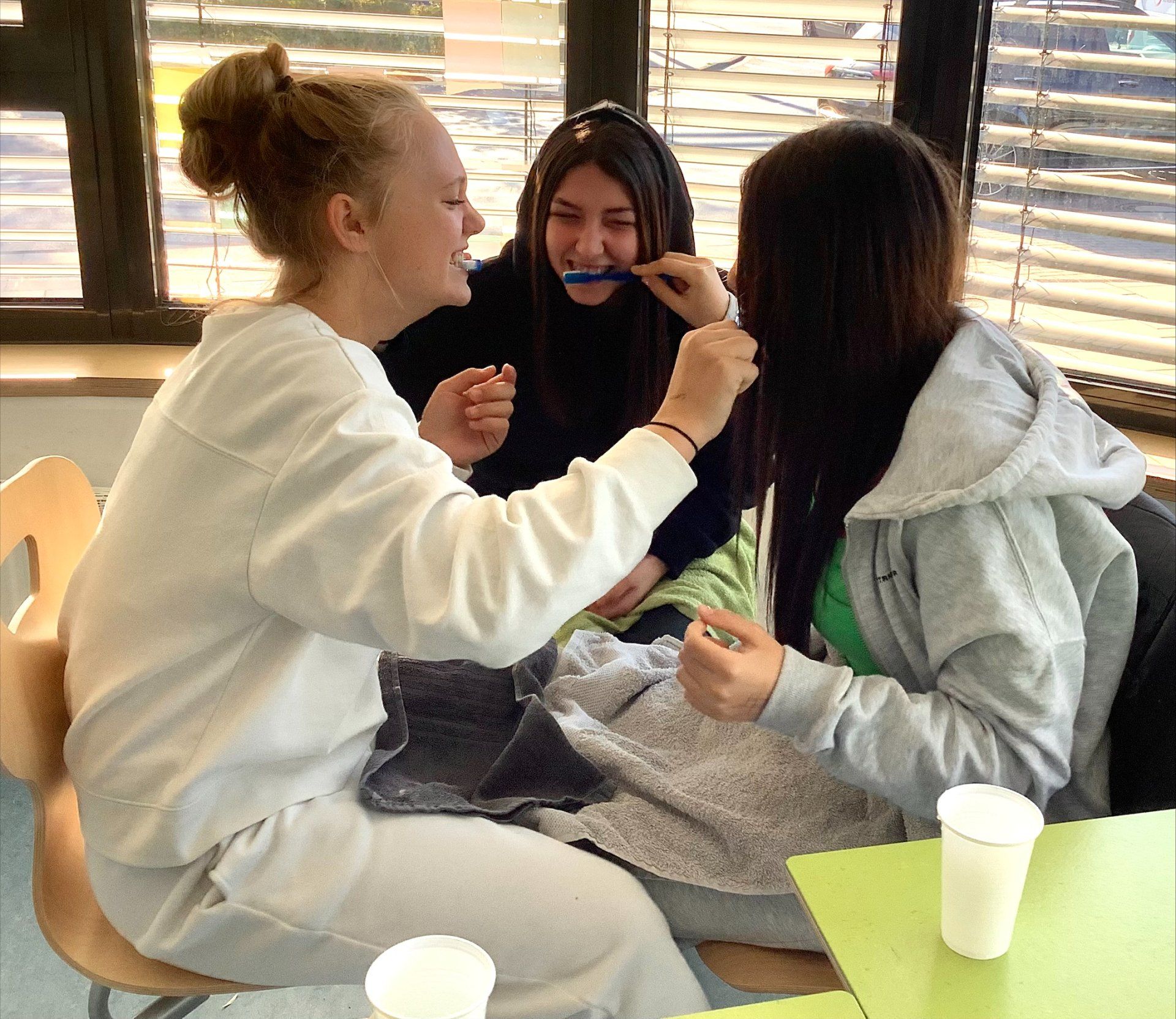 Jemanden zu pflegen kann eine Überwindung sein, aber wie wir bei verschiedenen Übungen gemerkt haben, ist es noch unangenehmer, sich pflegen zu lassen! Dazu haben wir ausprobiert, uns gegenseitig die Zähne zu putzen. Das war feucht-fröhlich!
