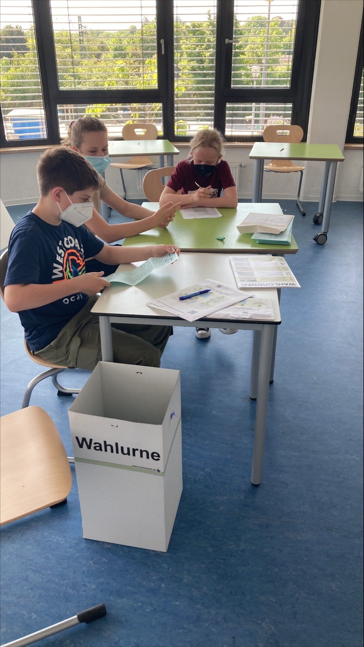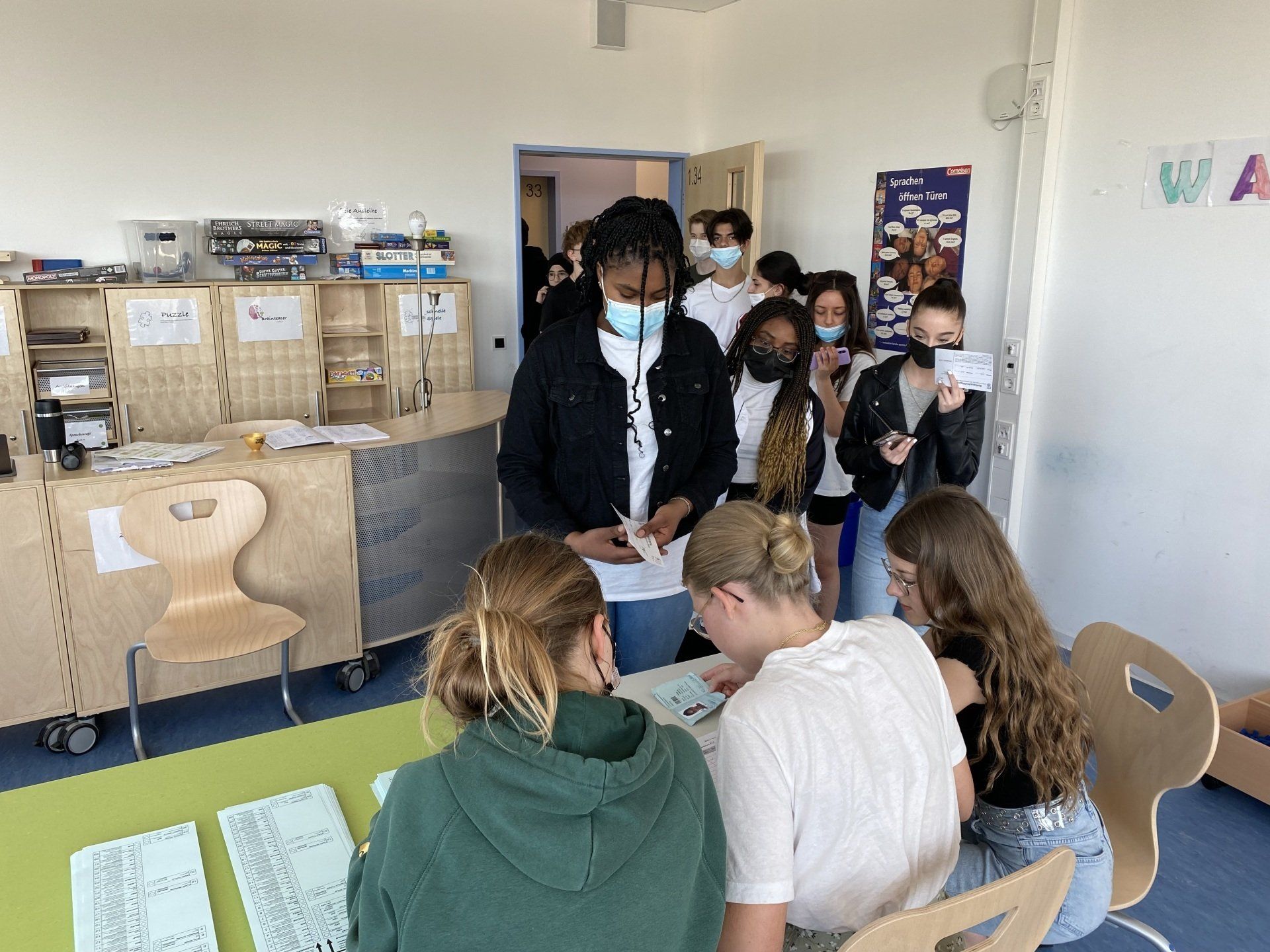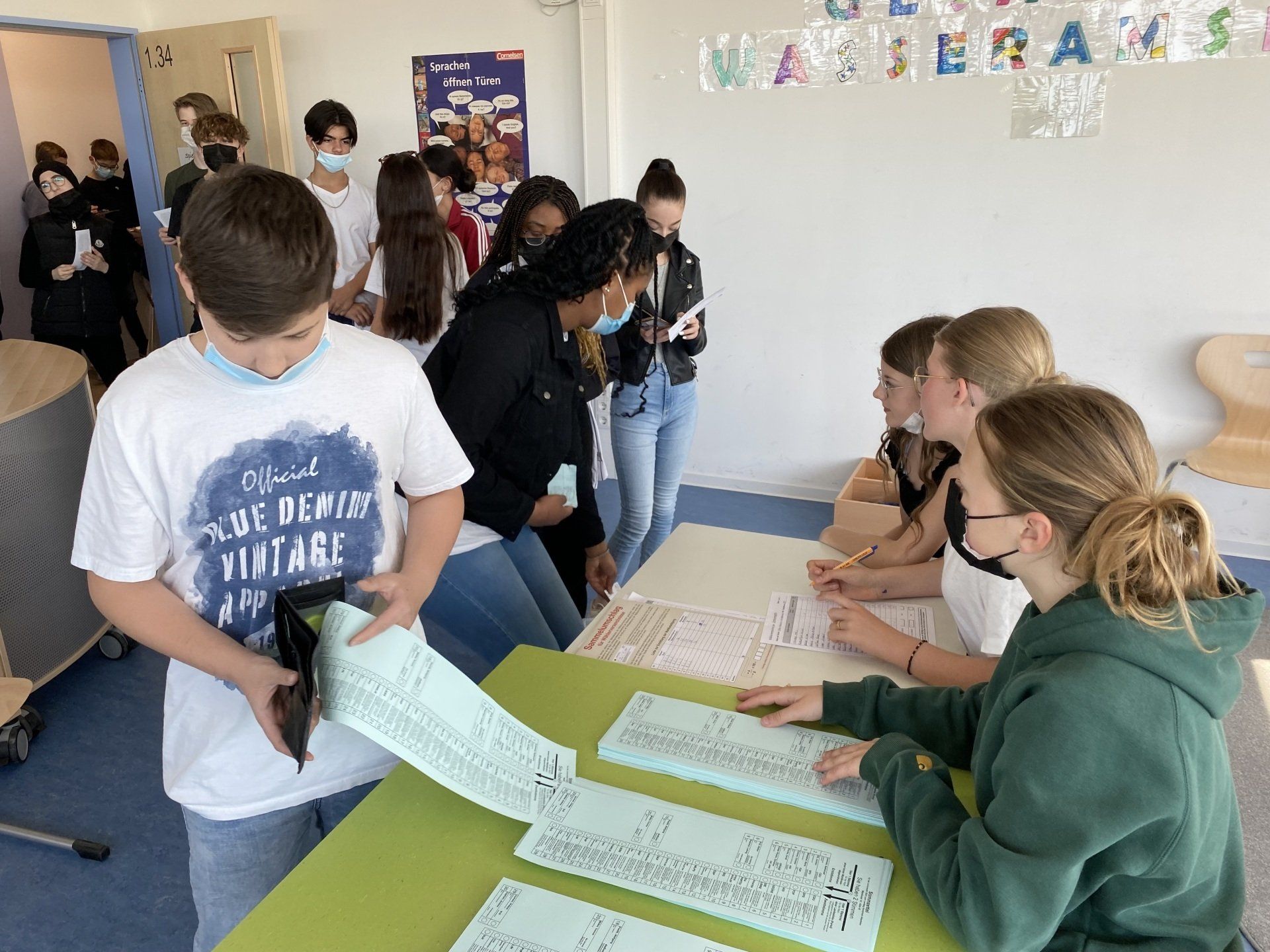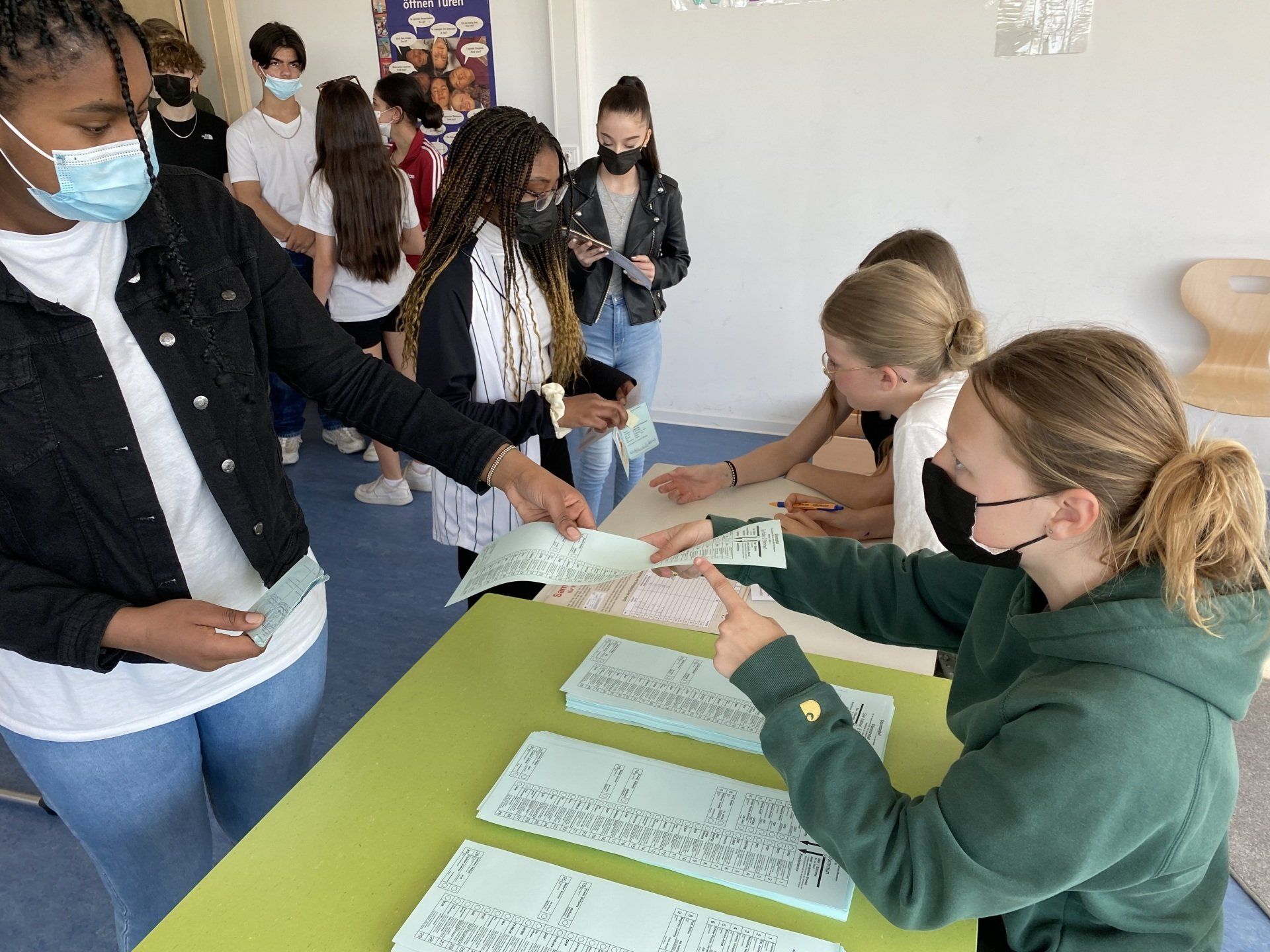 Die freiwilligen Wahlhelfer*innen legten im Vorfeld die Wählerverzeichnisse an und verteilten die Wahlbenachrichtigungen. Am Tag der Wahl kontrollierten sie Wahlbenachrichtigungen und Schüler*innenausweise und verteilten die Stimmzettel. Wie im echten Wahllokal wurde natürlich geheim in einer Wahlkabine gewählt und die Stimmzettel wurden in der dafür vorgesehenen Wahlurne abgegeben.