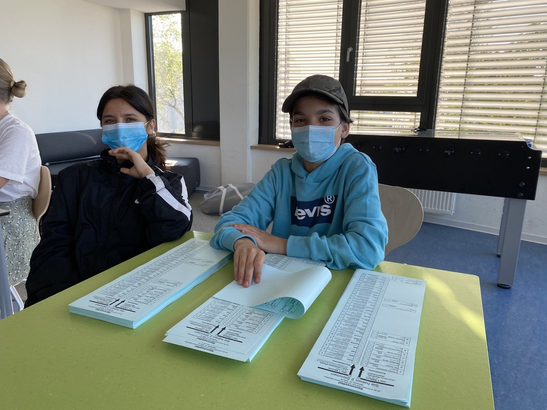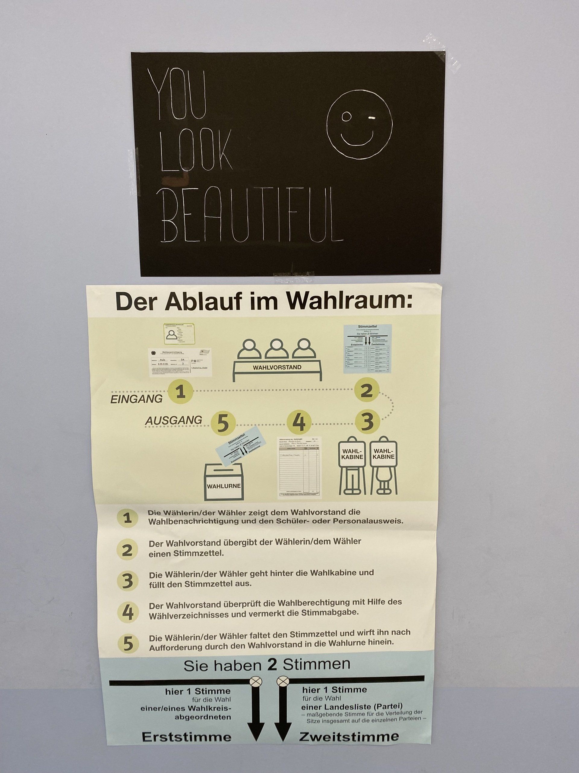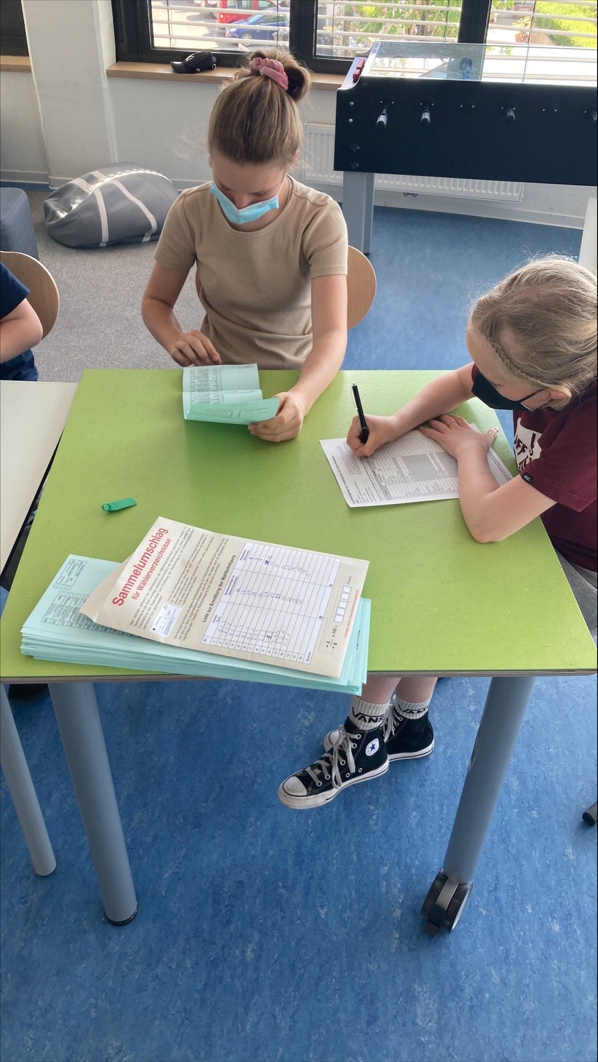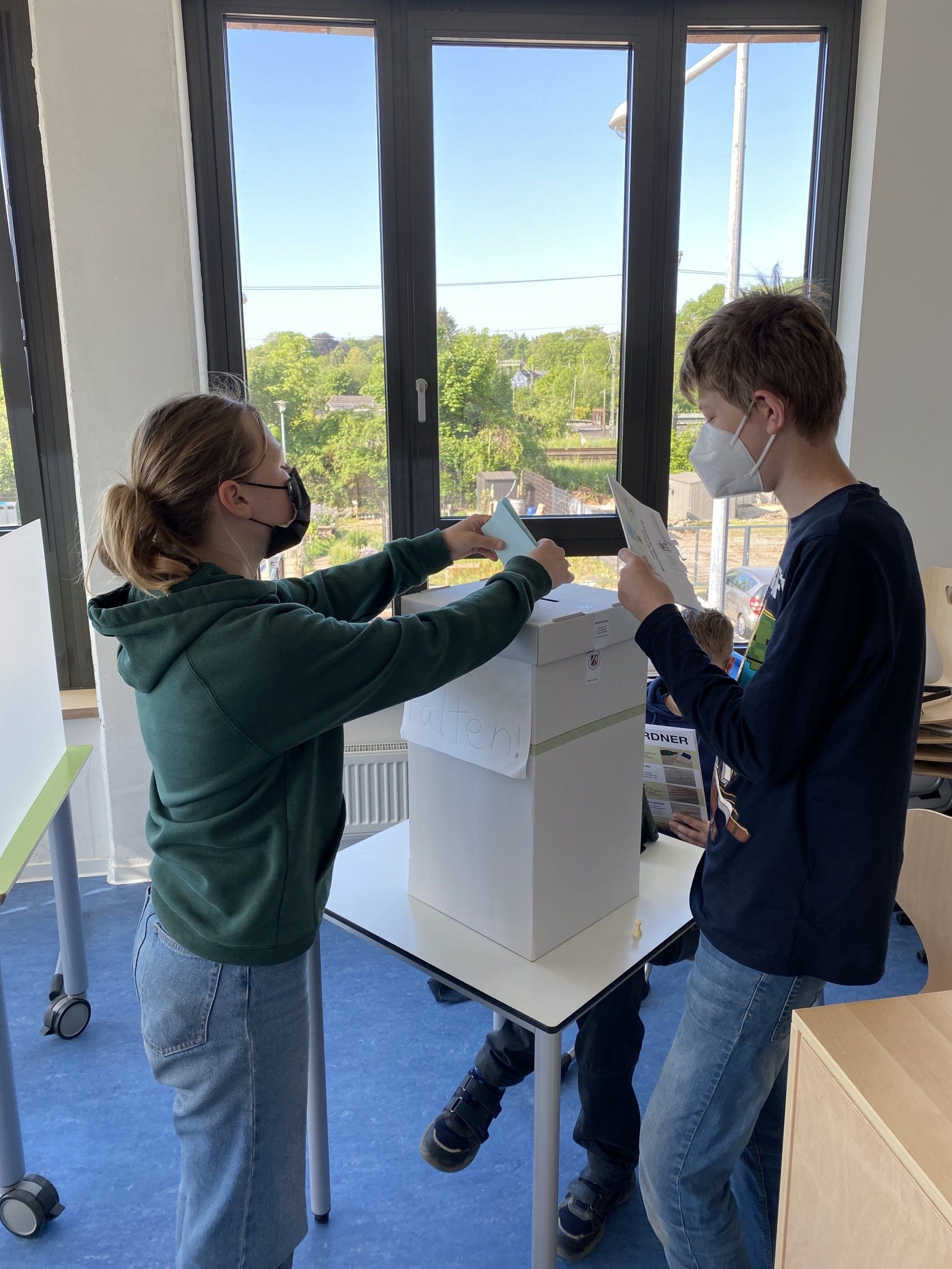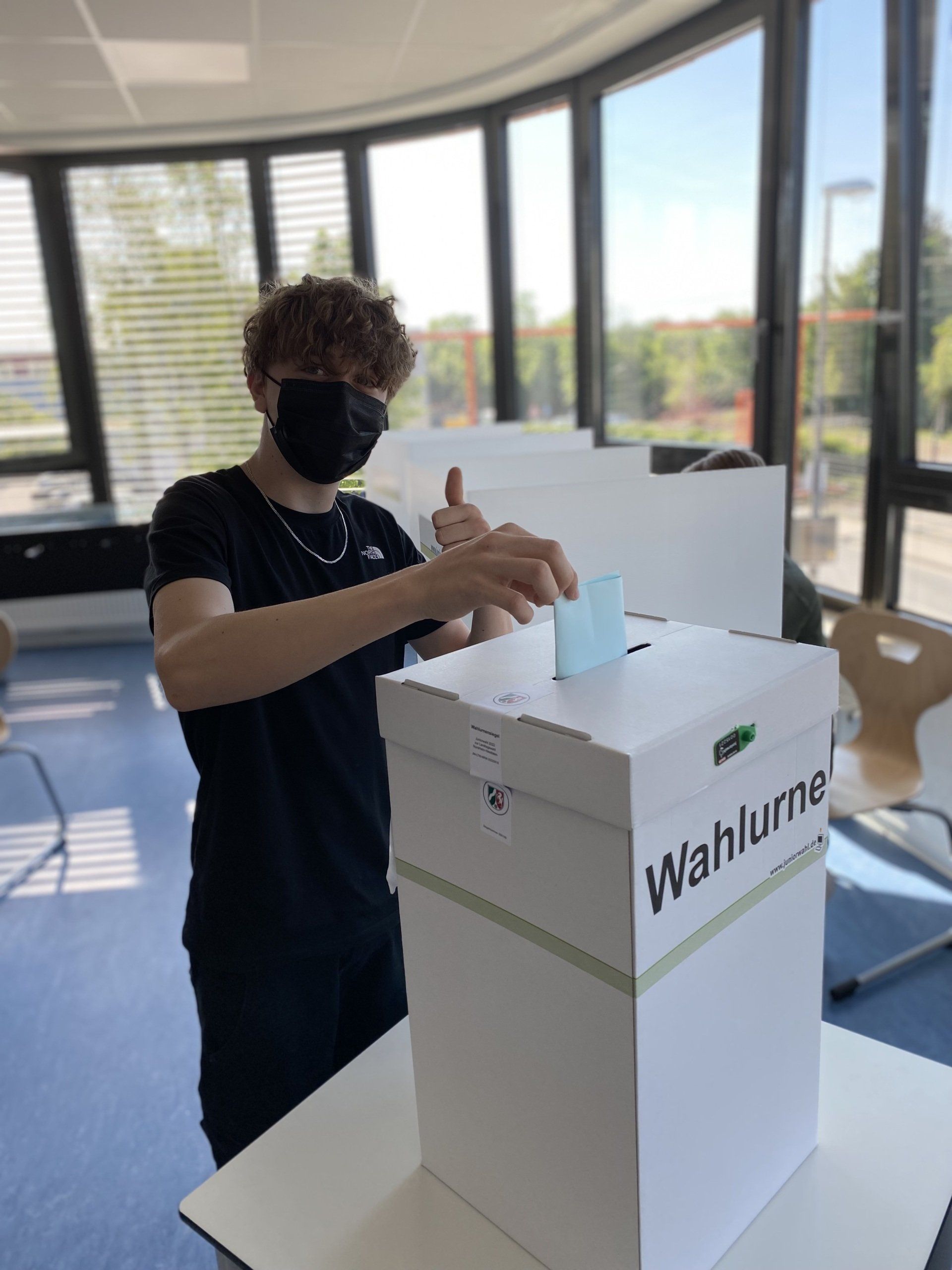 Die freiwilligen Wahlhelfer*innen legten im Vorfeld die Wählerverzeichnisse an und verteilten die Wahlbenachrichtigungen. Am Tag der Wahl kontrollierten sie Wahlbenachrichtigungen und Schüler*innenausweise und verteilten die Stimmzettel. Wie im echten Wahllokal wurde natürlich geheim in einer Wahlkabine gewählt und die Stimmzettel wurden in der dafür vorgesehenen Wahlurne abgegeben.