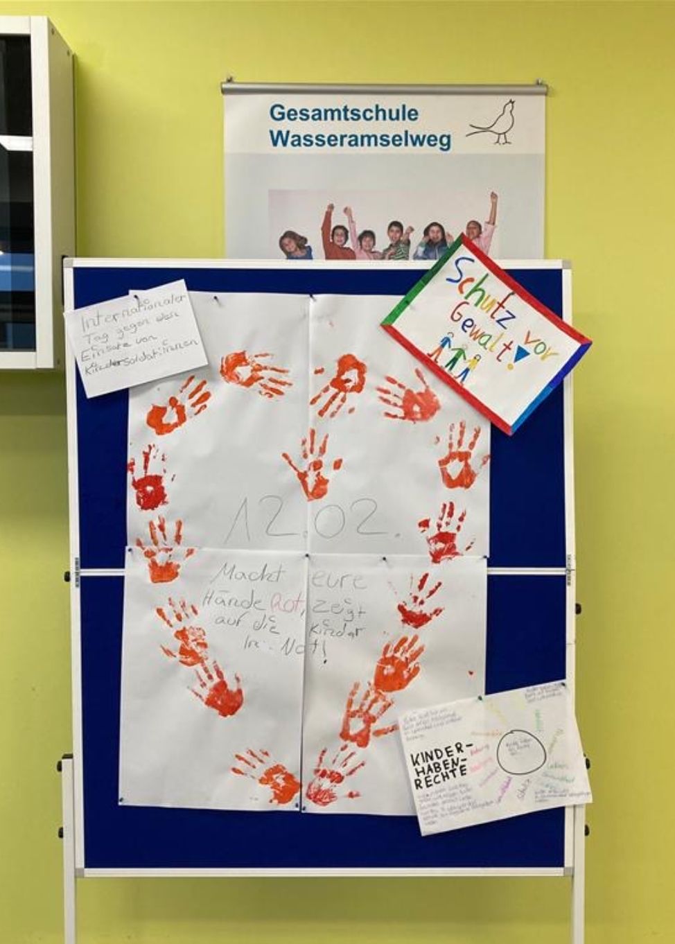 Weltweit wird am 12. Februar mit dem Red Hand Day ein klares Zeichen gegen den Missbrauch von Kindern als Soldaten und Soldatinnen gesetzt. Die Ehrenwasseramseln der Jahrgangsstufe 6 haben sich mit ihren roten Handabdrücken an der Aktion beteiligt und symbolisch die Forderung gegen den Einsatz von Kindern als Soldatinnen und Soldaten im Rahmen der UN-Kinderrechtskonventionen ausgesprochen.