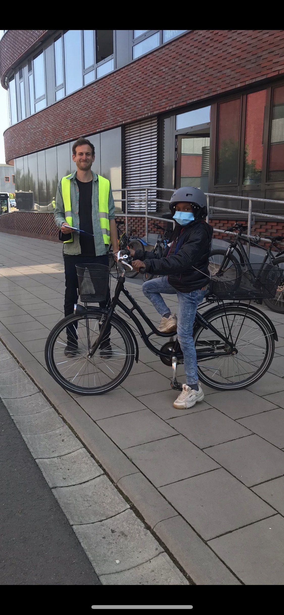 Um 9:00 Uhr sind wir auf dem Schulhof gegangen und der Polizist Martin hat unsere Fahrräder auf die Sicherheit geprüft. Nur wenige Kinder haben keinen Sticker bekommen. Unser Lehrer Henning hat einige kleine Probleme an unseren Fahrrädern repariert. Bevor wir starten konnten hatten wir eine Pause. Währenddessen haben sich die Eltern an den verschiedenen Orten aufgestellt, um unsere Fahrradleistung zu überprüfen.