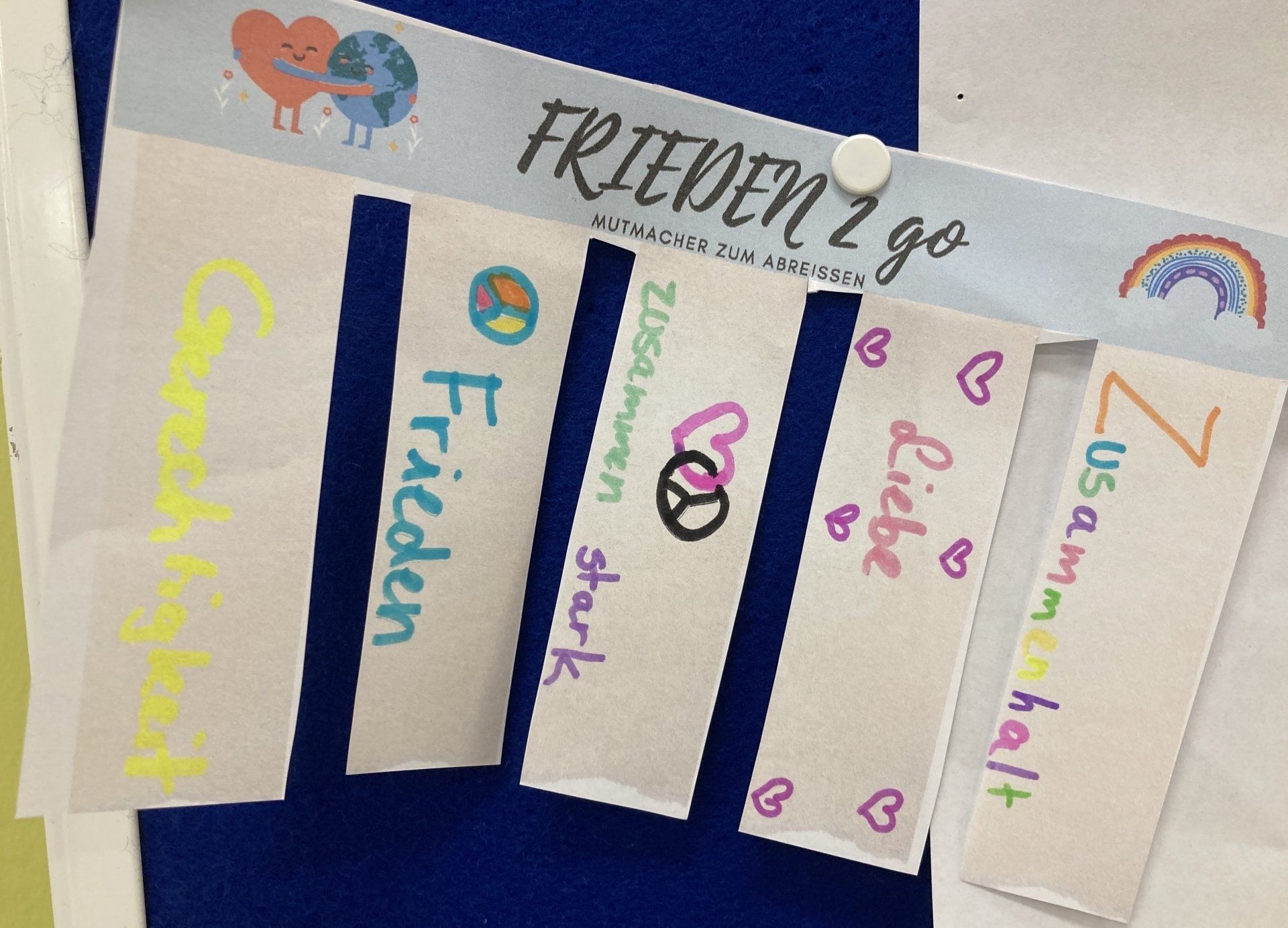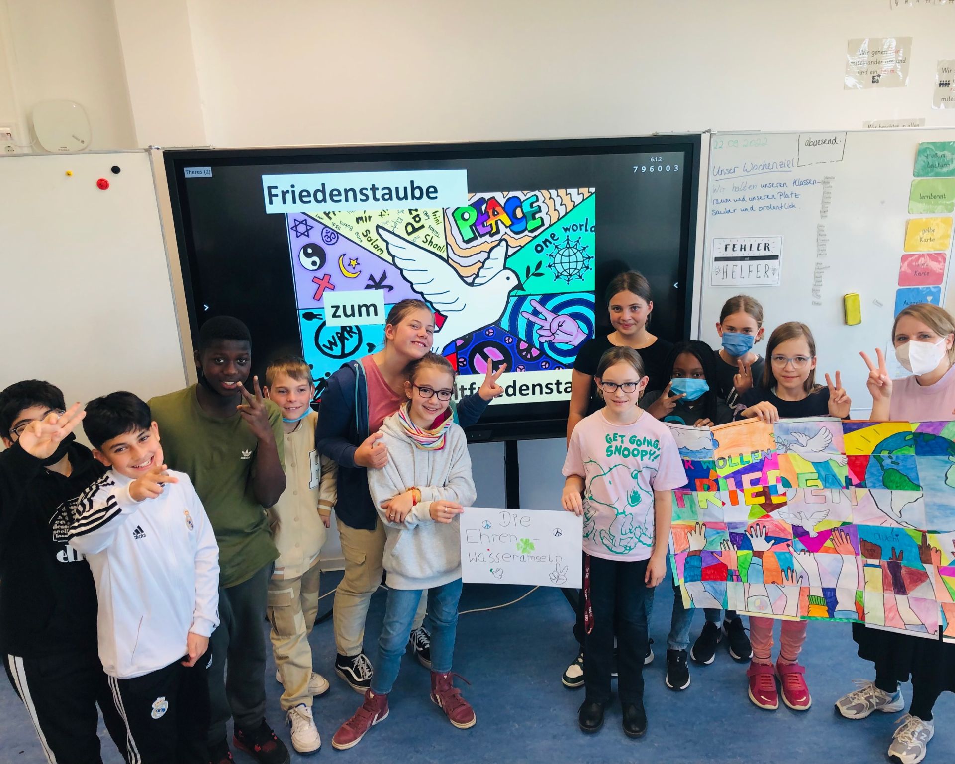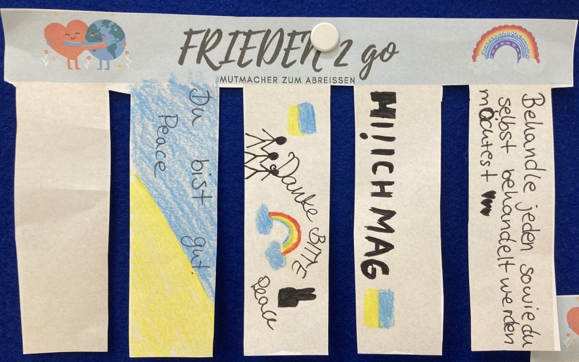 Zum Weltfriedenstag haben sich die Schülerinnen und Schüler kreativ mit der Thematik auseinandergesetzt. In ihren eigenen Friedensbriefen konnten sie zum Ausdruck bringen, was sie über Krieg denken und wie ein friedliches Zusammenleben möglich wäre. Die Ehrenwasseramseln der Jahrgangsstufe 7 setzten gemeinsam in einem Video Statements zum Themenfeld „Krieg und Frieden“, während die Ehrenwasseramseln der Jahrgangsstufe 6 ein großes Friedensplakat sowie „Mutmacher zum Abreißen – Frieden 2 Go“ für das Foyer gestaltet haben.