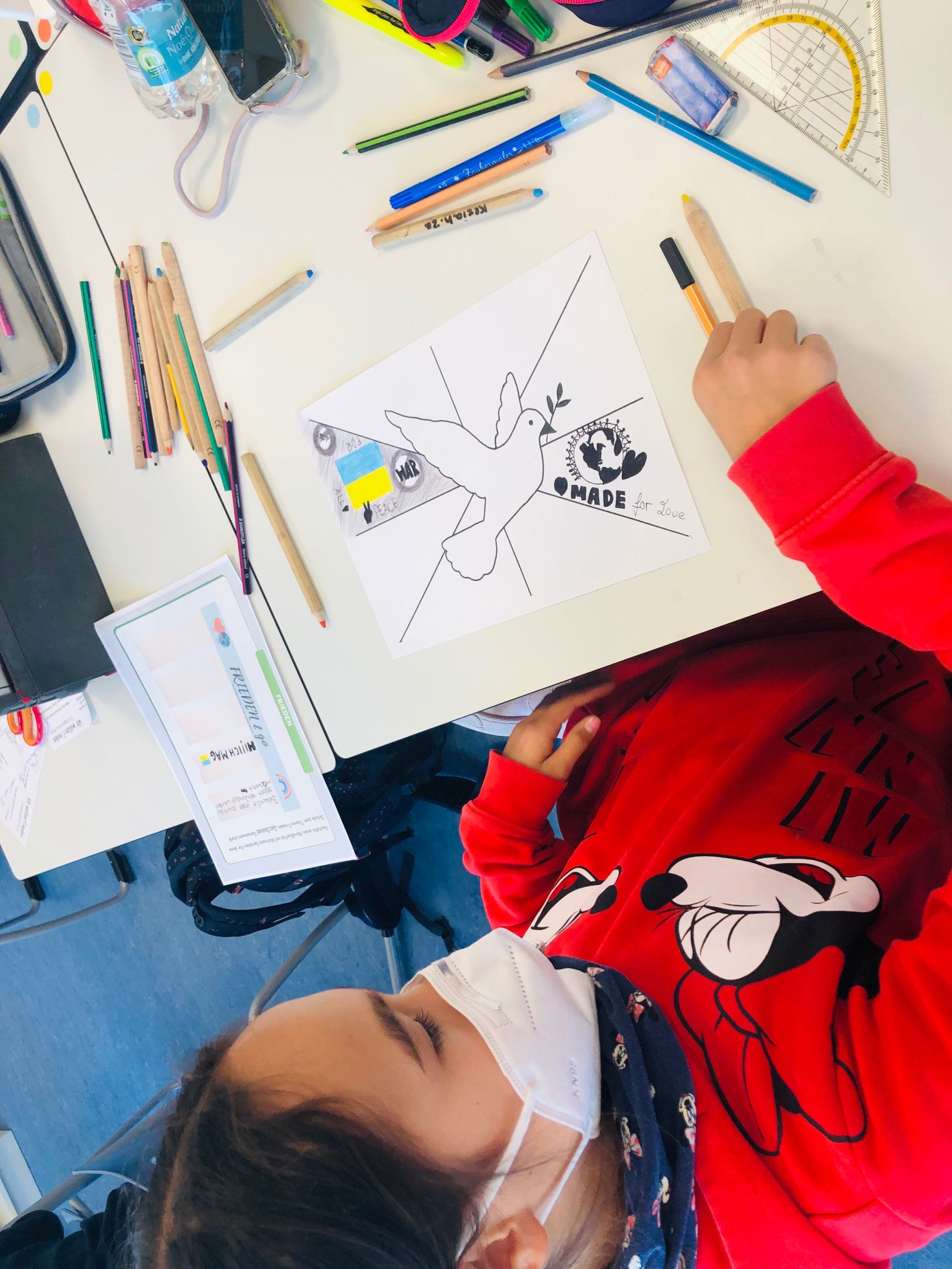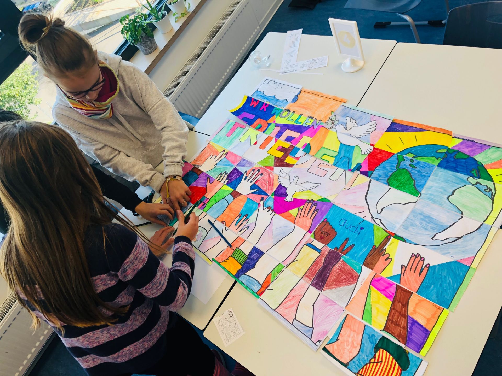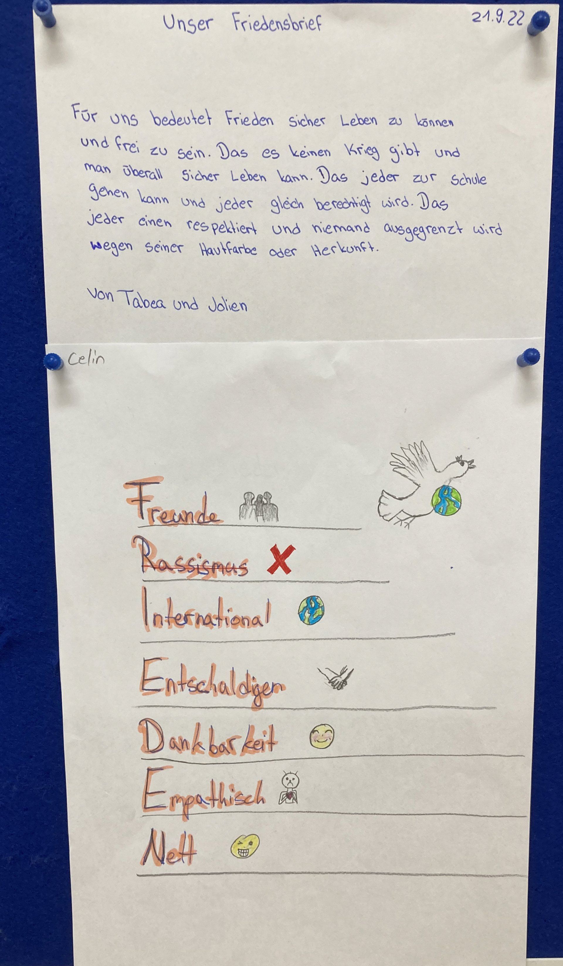 Zum Weltfriedenstag haben sich die Schülerinnen und Schüler kreativ mit der Thematik auseinandergesetzt. In ihren eigenen Friedensbriefen konnten sie zum Ausdruck bringen, was sie über Krieg denken und wie ein friedliches Zusammenleben möglich wäre. Die Ehrenwasseramseln der Jahrgangsstufe 7 setzten gemeinsam in einem Video Statements zum Themenfeld „Krieg und Frieden“, während die Ehrenwasseramseln der Jahrgangsstufe 6 ein großes Friedensplakat sowie „Mutmacher zum Abreißen – Frieden 2 Go“ für das Foyer gestaltet haben.