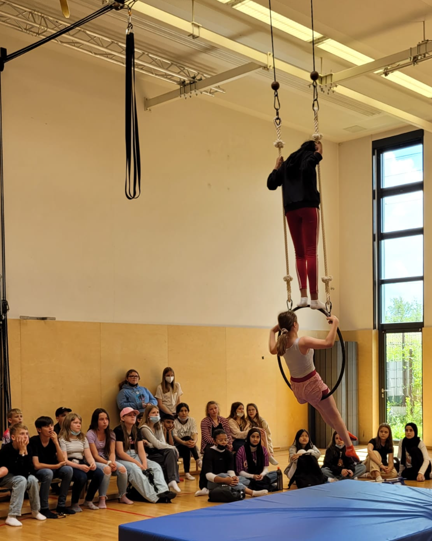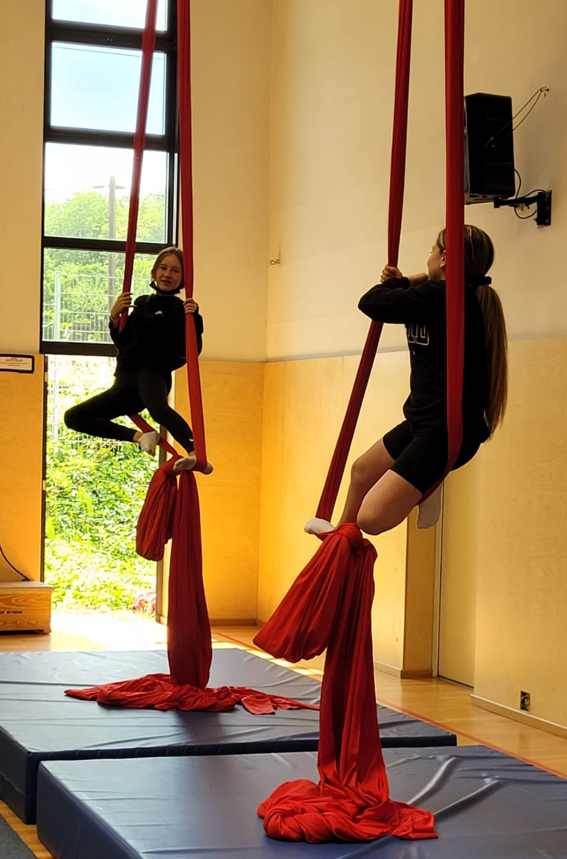 Die Abschlussaufführung der TuN-Kurse (Talent und Neigung) der Jahrgänge 5 und 6 begeistert die Zuschauer*innen mit spektakulären Tricks. In der Höhe wurden am Trapez, Luftring und am Vertikaltuch tolle Nummern gezeigt!